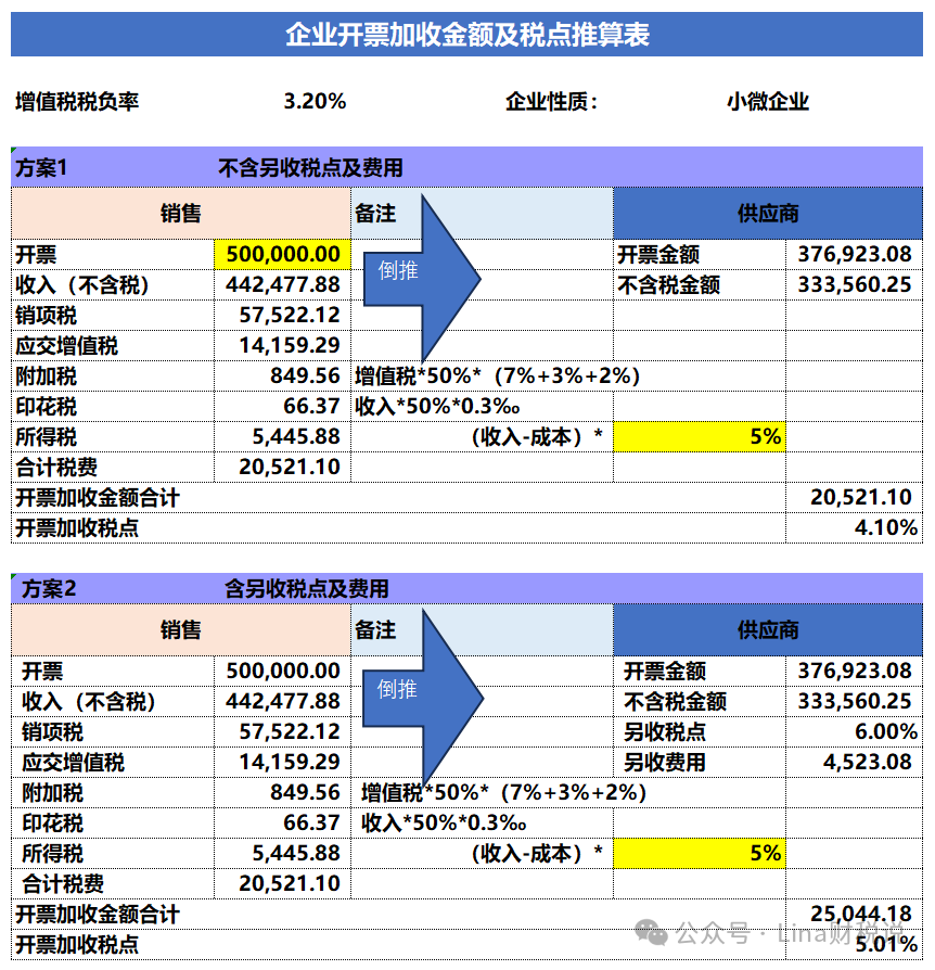 总结:如开票1,102.5元,至少需加7.36%,所以要8个点以上 03 开票加收金额及税点自动推算大礼包 以上案例,可以清晰地看到不同纳税人类型和税率下的综合税负率,在实操中开票税点的推算还会受到增值税税负率等因素的影响,我给大家做了一个开票加税点的自动计算表,你直接把数字填进去就可以算出加多少个税点,一起来试试看吧~ 阅读原文:https://mp.weixin.qq.com/s/ae5rC1djwv-rXKbxPX-dlQ 该文章在 2024/12/30 13:05:49 编辑过 |