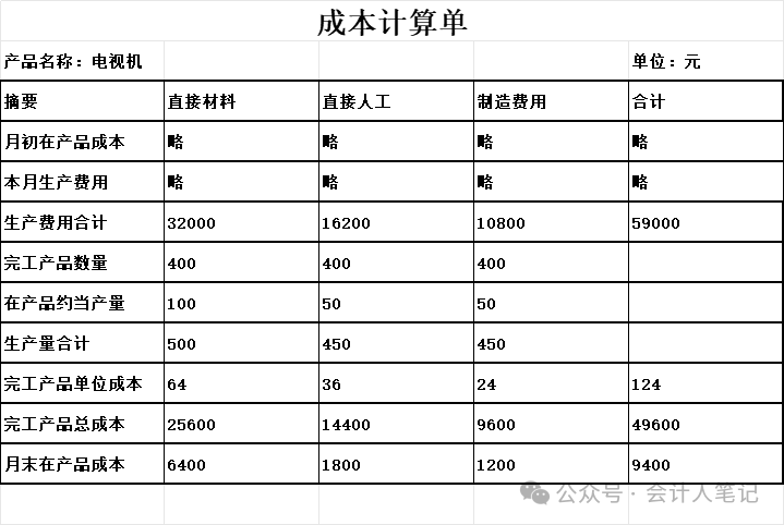 例:牛马企业生产电视机,本月完工400件,月末在产品100件,在产品的完工程度为50%;本月电视机生产成本明细账中所列月初在产品成本和本月生产费用共计59000元,其中直接材料费用32000元,直接人工16200元,制造费用10800元。原材料系生产开始时一次投入。 分配材料费用 月末在产品约当产量=100×100%=100(件) 原材料费用分配率=32000÷(400+100)=64(元/件) 完工产品应负担原材料费用=400×64=25600(元) 月末在产品应负担原材料费用=100×64=6400(元) 分配人工费用 月末在产品约当产量=100×50%=50(件) 直接人工分配率=16200÷(400+50)=36(元/件) 完工产品应负担直接人工费用=400×36=14400(元) 在产品应负担直接人工费用=50×36=1800(元) 分配制造费用 制造费用分配率=10800÷(400+50)=24(元/件) 完工产品应负担制造费用=400×24=9600(元) 在产品应负担制造费用=50×24=1200(元) 计算完工产品成本和月末在产品成本 A产品的完工成本=25600+14400+9600=49600(元) 月末在产品成本=6400+1800+1200=9400(元) ![]() 四、约当产量法小结:三步走,稳准算掌握了完工产品和在产品的成本分配方法,尤其是约当产量法这个 “利器”,咱们制造业成本会计在成本核算的战场上就更有底气啦! 点晴模切ERP更多信息:http://moqie.clicksun.cn,联系电话:4001861886 该文章在 2024/12/30 12:59:36 编辑过 |