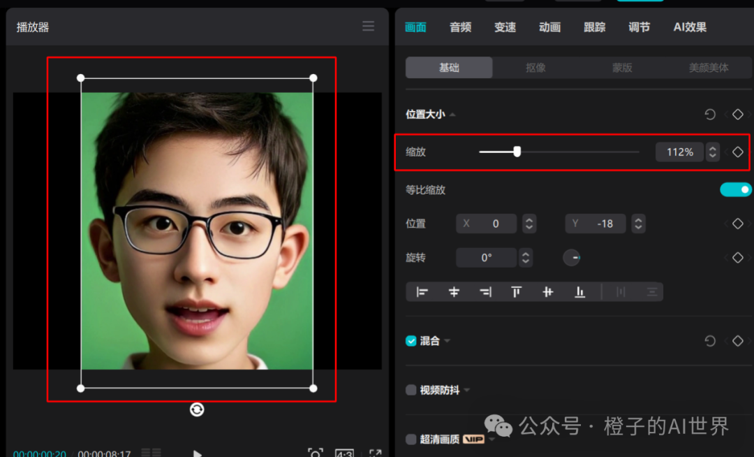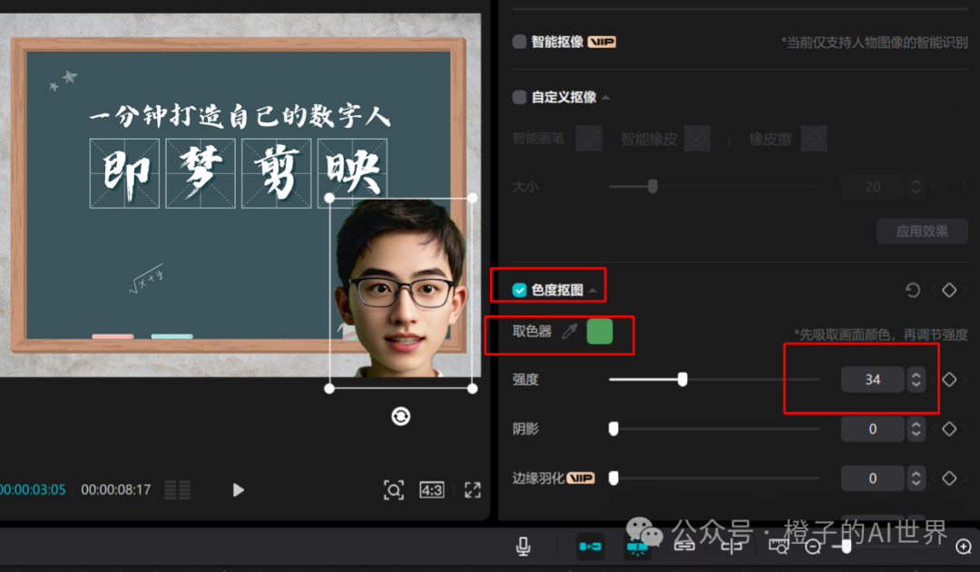前段时间用即创制作数字人的文章爆了,但是后续问题就来了,即创需要加入组织,而且需要在3个月内投入广告才可以制作数字人,所以对于一些没有投放需求的用户来说,这就意味着数字人的功能无法继续使用了。橙子最近研究了一套用即梦和剪映,两大免费的软件就可以制作出数字人来。选择自己一张满意的照片,最好是可以完整的识别到脸部的。例如:迪士尼皮克斯工作室风格,一个可爱的男孩,最佳画质,8K,背景是纯绿色。背景这一点非常的重要。一定是纯绿色,为了方便后期进行抠图。比如选择这张,水印是没有遮住人物的主体部分的,所以非常方便于后期生成视频,进行绿幕抠图。导入你选择好的数字人形象图片,再写入要朗读的文案即可。选择抠图---色度抠图--取色器选择绿色(只需要吸一下绿色就可以)--调节强度。就完成了抠图的操作。其实,用这两个AI工具制作数字人相对来说比较简单,而且使用了自己形象为参照图,这样就会避免掉公模相似的问题了。