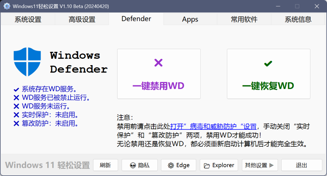 Windows11轻松设置是专门为使用WIN11的用户推出的系统设置软件,该软件可以帮助用户直接禁用各种系统运行的服务和功能,并且还支持自动选择是否更新硬件驱动,适用于Win11所有版本,用户可以在这里随时对系统进行设置,很好的满足了用户的多种需求。 软件功能介绍 1.快速关闭各项系统功能(俗称优化系统) UAC设置找不到?自动更新不会关?windows defender关不了?这些对windows11轻松设置来说都不是问题!对难用的功能说goodbye~ 注:禁用windows defender后请安装一款杀毒软件(如:火绒、卡巴斯基 360)不要让你的电脑系统处于裸奔状态!!!