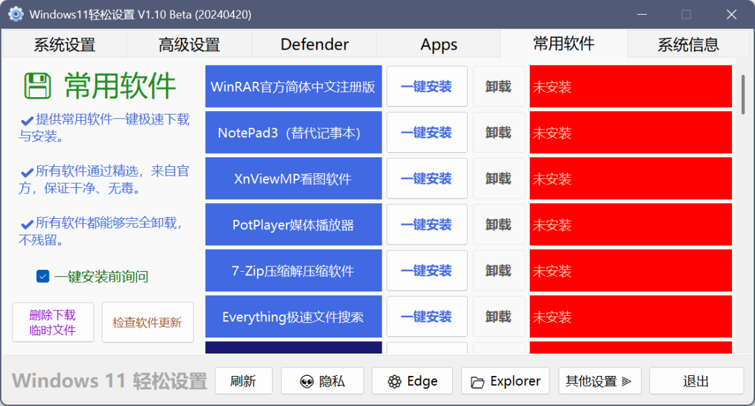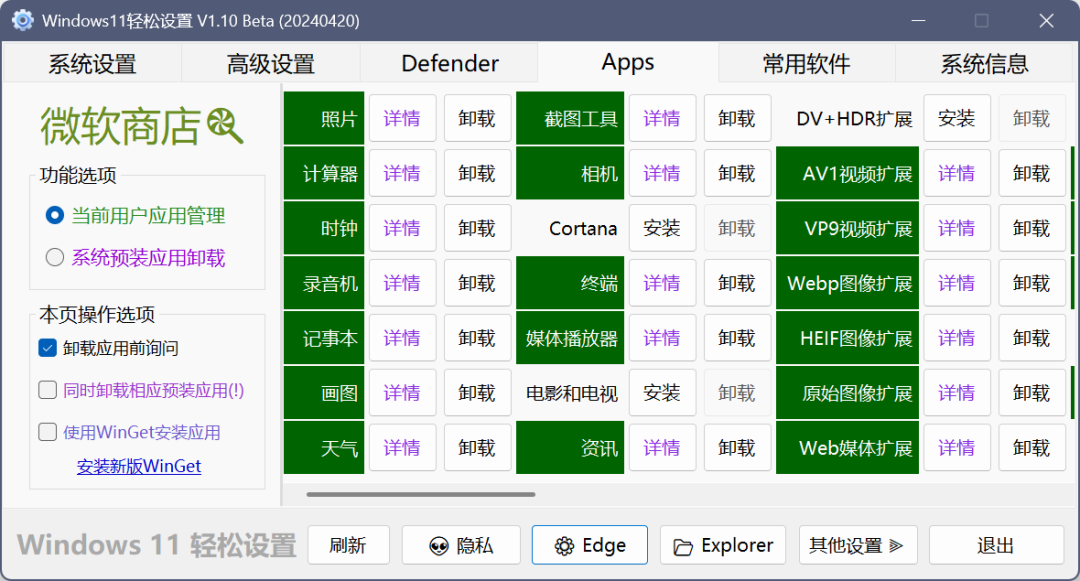 2.快速安装/卸载软件 windows轻松设置可以帮助你轻松卸载系统自带的难用软件,并且提供常用绿色软件下载功能,让电脑在保持干净的同时安全 如HEVC视频扩展(我也不知道为啥一个必要软件微软商店还要花7元买)