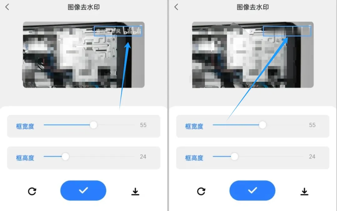 图像去水印的操作也十分简单,本质上类似于PS的模糊功能。只需选中水印区域,工具便会将水印模糊处理,使其接近背景效果,几乎看不出来。至于软件的其他功能,大家可以自行探索,相信大部分人还是冲着去水印功能来的吧!