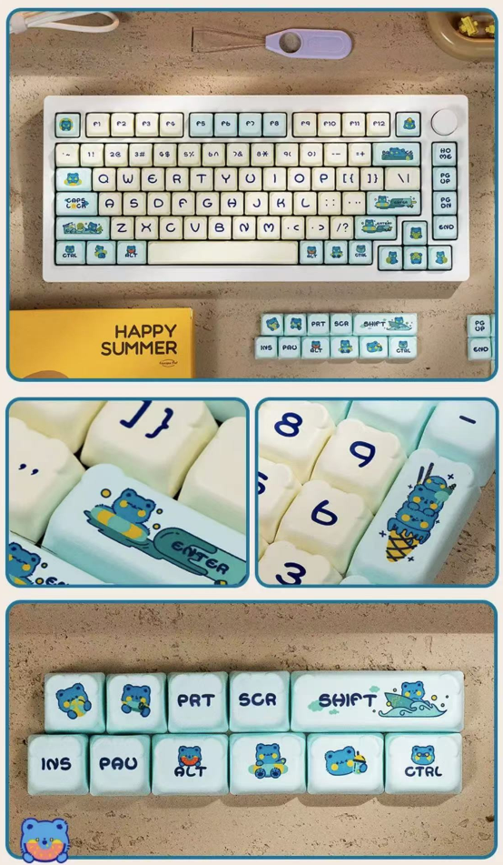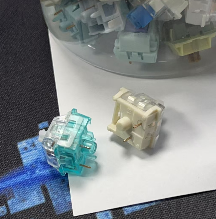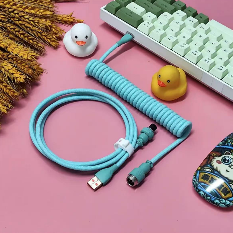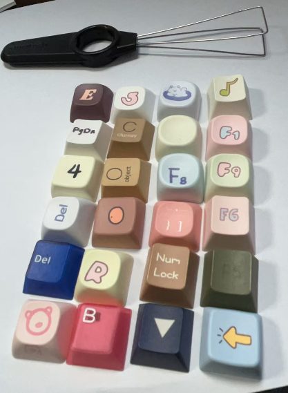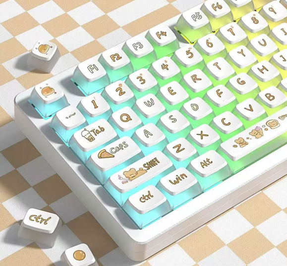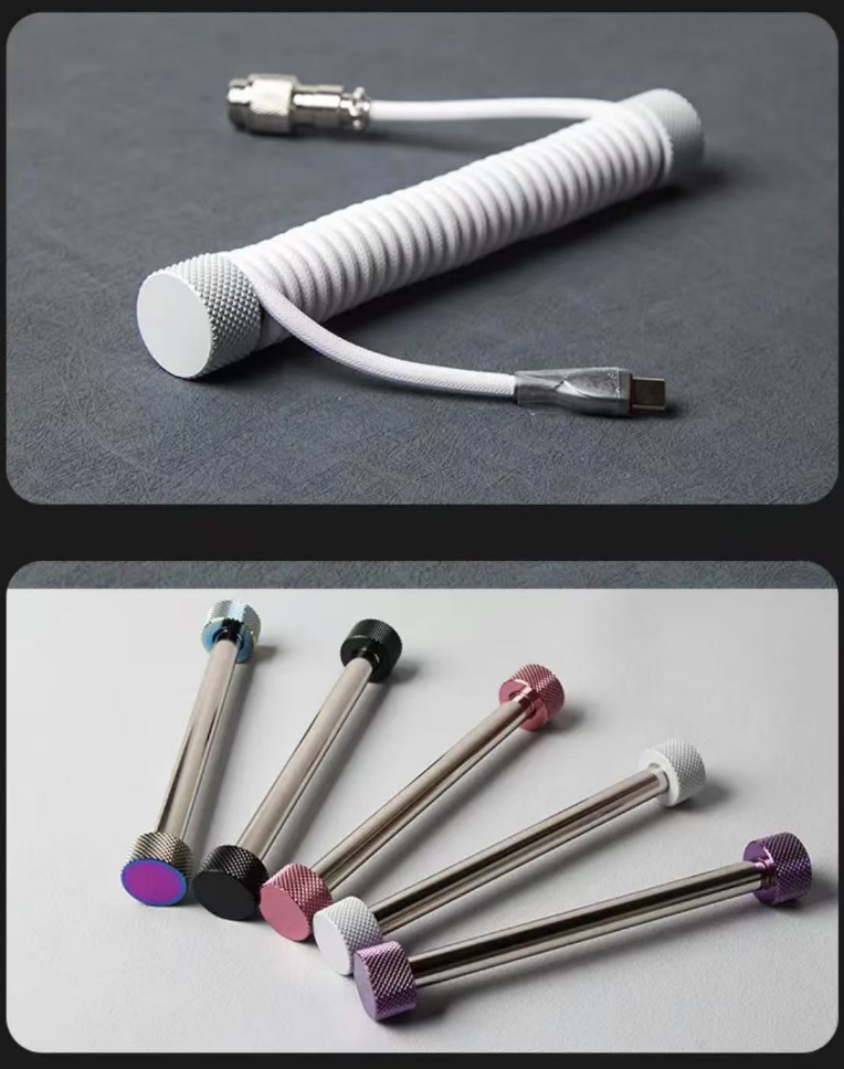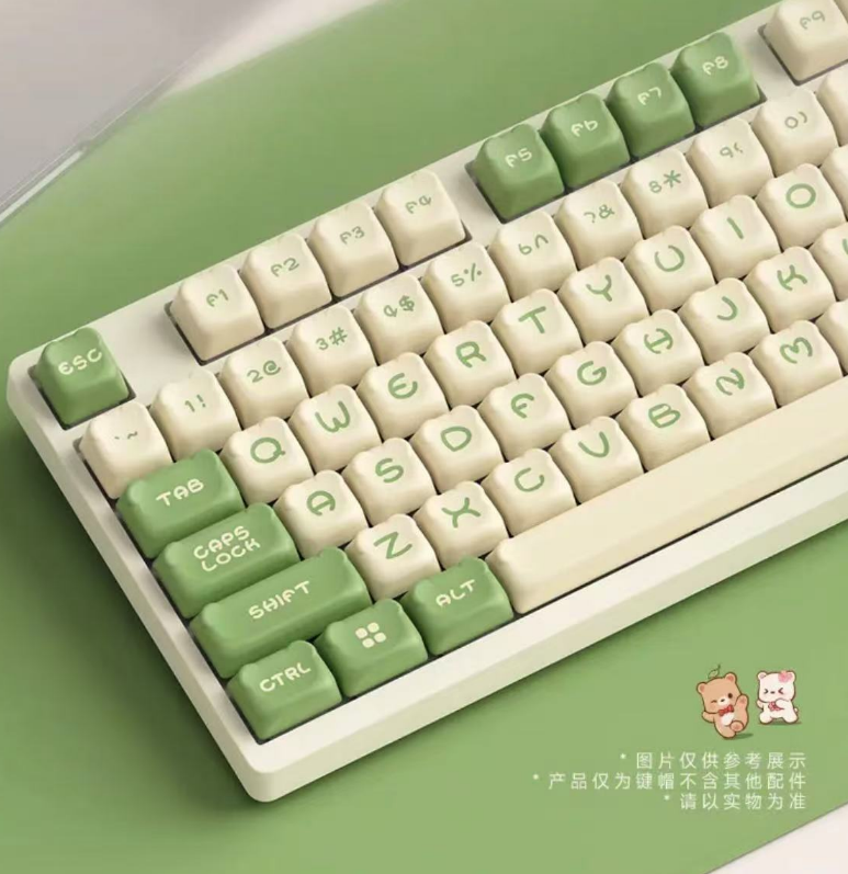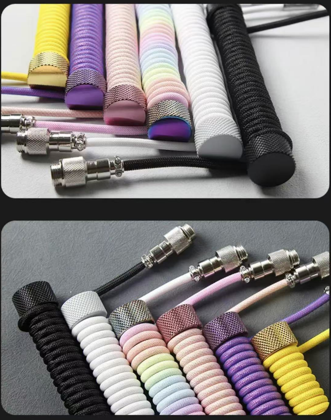使用热升华工艺的键帽一般是不透光的,带RGB灯效的键盘一般会使用透光度好的材质和工艺。比如使用PBT+PC材质的双层布丁键帽:热升华的键帽虽然不透光,但因颜色丰富、图案精美,效果也是不错的。比如以下例子:换完键帽,下面开始换轴体。其中支持热插拔的机械键盘被称为客制化键盘,拔掉键帽、轴体的键盘叫客制化套件。套件指的就是没有键帽、轴体的键盘,可以理解为键盘底座。轴体分三脚、五脚,其中五脚的可以掰断两只脚变成三脚的轴体。除了青红茶黑轴之外,国产轴又多了很多,比如灰木轴、晚樱轴、裤衩子轴、烟雨轴等。叫什么不重要,还是可以对应到线性轴和段落轴两类上。最后就剩机械键盘的线了,一般机械键盘的线都是 USB type-c 接口的线,做到了键线分离。一般的 type-c 也可以凑合着用,但发烧友用的线叫航插线。原因是它设计成了两段式航空插座接口,方便收纳。图片来源: