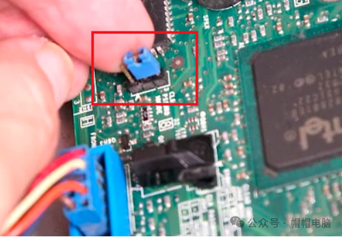 2、找到图片所示的一个端口,一般是三根针,针帽是接的两个头,拔下来,等待30分钟装上去,然后开机看下bios密码是否清除。