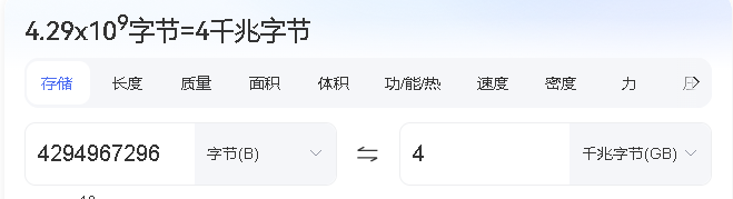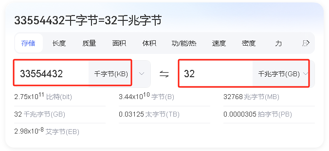 上图的33554432,单位是千字节(KB),我们需要转换成千兆字节(GB) 1GB=1024MB,1MB=1024KB。 转换成GB就是:33554432÷1024÷1024=32GB,那么我这台电脑支持的最大内存就是32G。 懒的计算的也可以直接搜索转换: