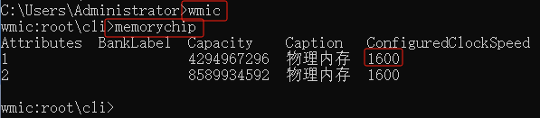 英文翻译: memphysical ——物理内存 get maxcapacity——获取最大容量 注意事项: 我们在选购内存时,需要注意内存条的工作频率,是DDR3、DDR4还是DDR5,还需要注意主板上的插槽类型,我们参考原内存条购买即可,选购过程中如有疑问还可咨询客服。 下面介绍一下wmic命令的其他用法: ①查看电脑的内存条工作频率: 先输入wmic 回车,再输入memorychip 回车即可