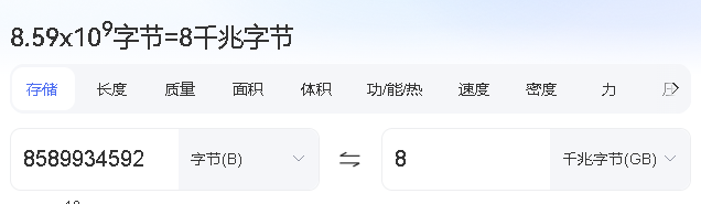 上图的1600即1600MHz,是内存条的工作频率,内存条的频率决定了其数据传输的速度。具体来说,1600MHz意味着内存条每秒可以完成1600次完整的读写操作。 上图的4294967296和8589934592单位是字节(B) 转换成GB需要除以三次1024。 4294967296÷1024÷1024÷1024=4(GB) 8589934592÷1024÷1024÷1024=8(GB) 所以我电脑目前的内存大小是12G。
