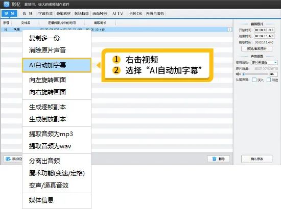 它支持自动识别语音并添加字幕,准确率相当高,且编辑字幕的功能灵活好用。用户只需选择“AI自动加字幕”,就能根据软件指引快速识别人声转成同步字幕。
