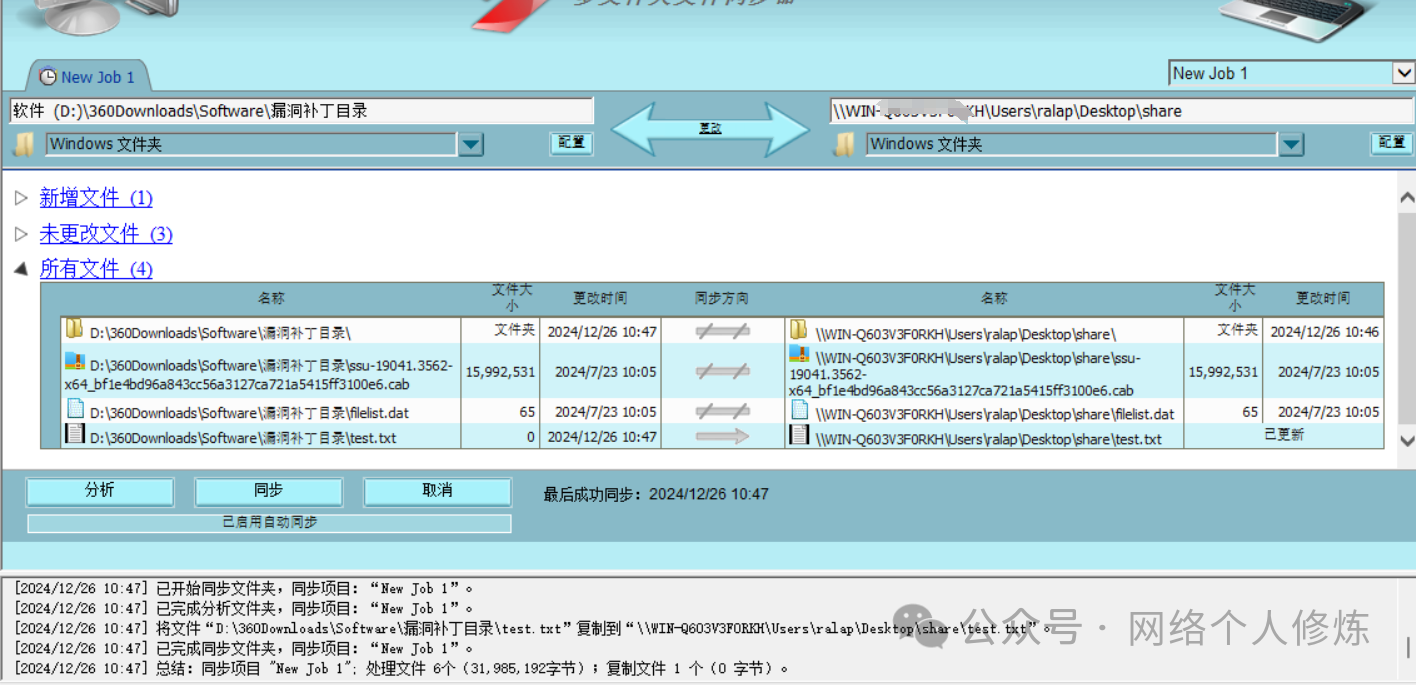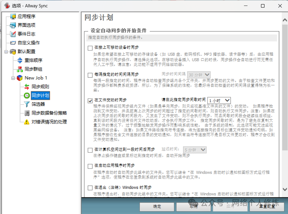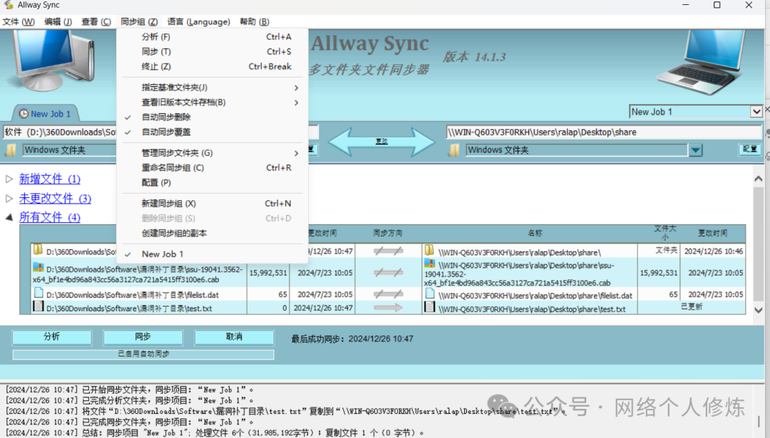 最近,我的一位同事在笔记本和台式机之间互传文件时遇到了麻烦,询问我是否有好的解决办法。经过研究,我发现 Allway Sync 这款免费专为 Windows 用户设计的文件同步工具非常适合此类需求。经过实际测试,Allway Sync 在笔记本和台式机之间的文件同步效果良好。以下是我总结的相关安装和使用步骤,希望对有类似需求的用户有所帮助。 一、安装步骤下载软件: 软件官网下载地址https://allwaysync.com,实测访问不了,测试软件是我在网上找的资源,经沙箱测试无毒。最新版及其他版本可自行在网上搜寻可靠资源获取示例软件。 ![]() 安装程序: 选择一台电脑进行安装:只需在一个设备上安装即可,因为同步任务可以配置为跨网络操作。 执行安装: 双击下载的 .exe 文件,点击“下一步”,接受许可协议。然后点击“下一步”直至完成安装。 ![]() ![]() ![]() ![]() ![]() 语言设置: 安装完成后,启动 Allway Sync。首次运行时,可以在界面中找到“Language”选项,切换至简体中文以方便使用。 ![]() ![]() 二、创建和配置同步任务添加同步任务: 在主界面中,点击“New Job1”创建新的同步任务。 指定本地和远程路径作为同步源和目标(本文通过共享文件夹方式同步两台主机)。 ![]() 配置同步选项: 在两个路径之间点击“更改”按钮,可以设置同步方向(单向或双向)以及是否启用自动同步删除、覆盖等功能。 根据需要调整同步规则,例如是否允许覆盖现有文件或同步删除操作。 ![]() 设置同步计划: 为了实现自动化,可以为每个同步任务配置定时计划。进入“自动同步选择同步组-配置-NewJob1”菜单,根据需求选择按指定时间、文件变动或计算机空闲等条件触发同步。 ![]() ![]() ![]() ![]() 手动同步: 如果不想等待自动同步的时间间隔生效,也可以随时点击界面上的“同步”按钮来立即执行同步任务。 ![]() 为了方便使用,可以设置 Allway Sync 在 Windows 启动时自动运行。具体步骤如下: 点击“同步组” > “配置” > “应用程序”,勾选“在 Windows 启动时以通知栏图标方式运行程序”。 ![]() 阅读原文:原文链接 该文章在 2025/1/2 12:57:35 编辑过 |