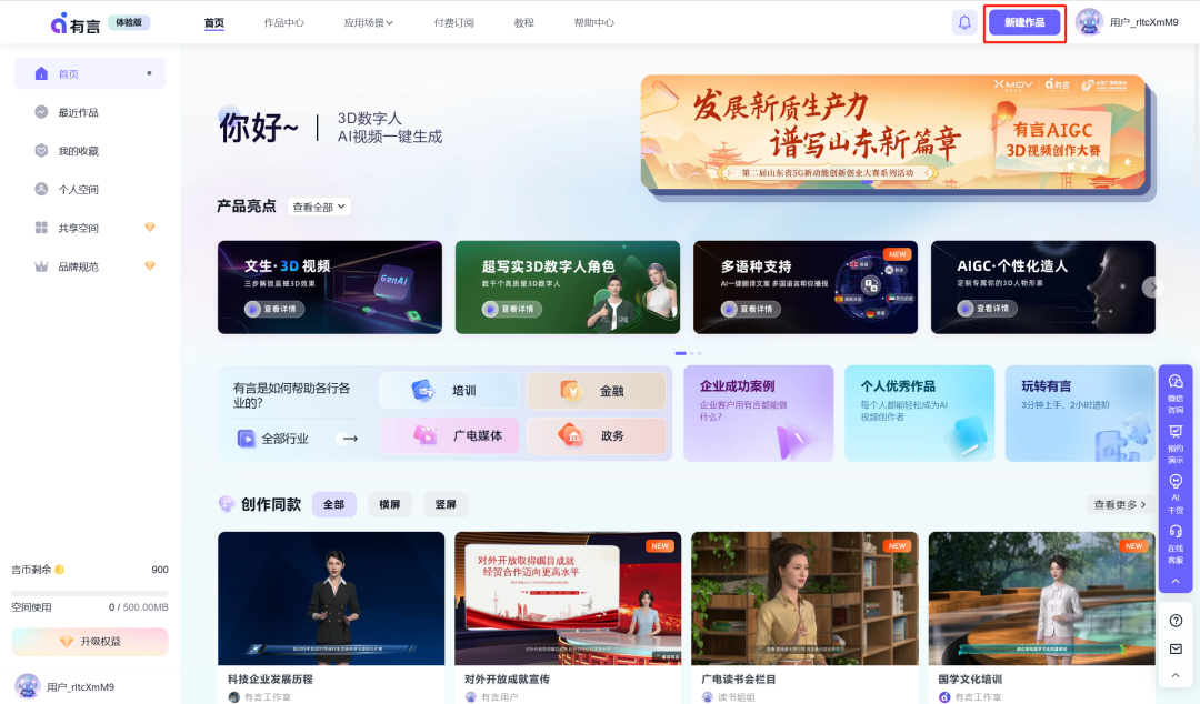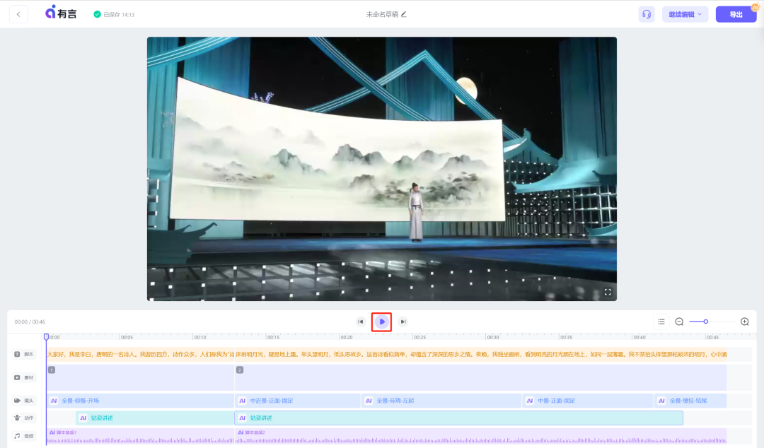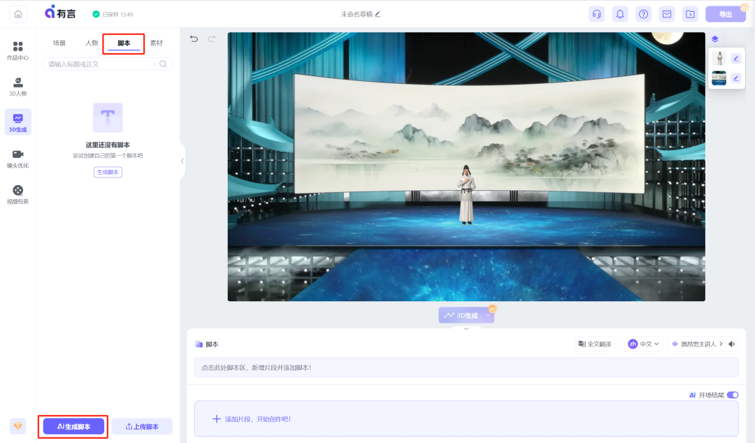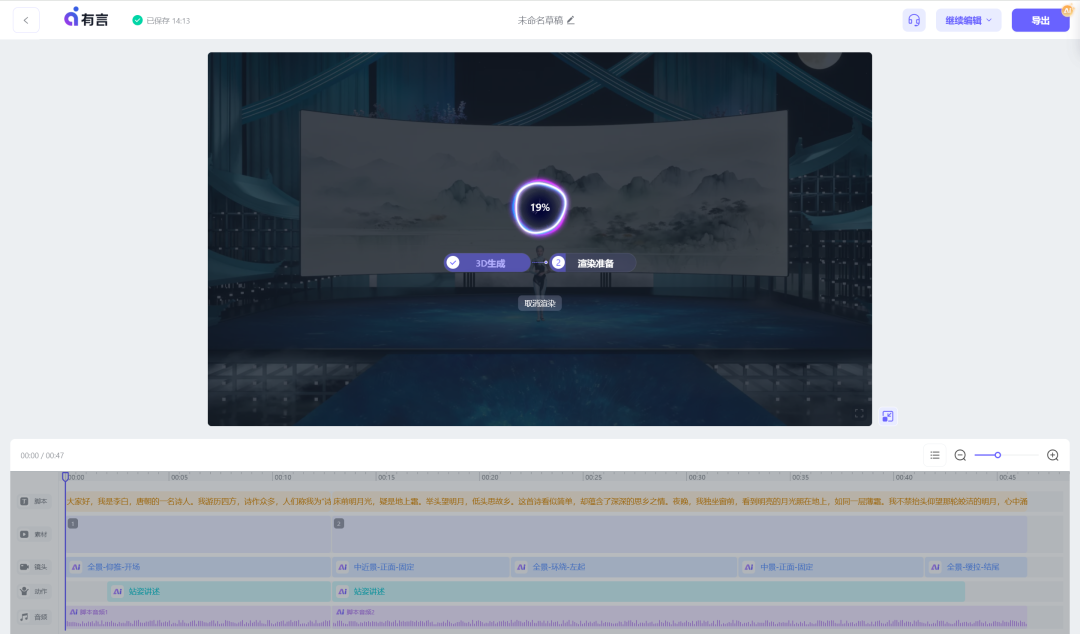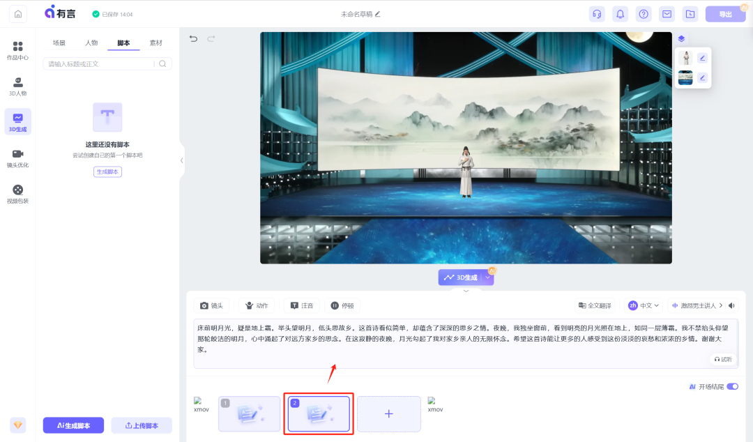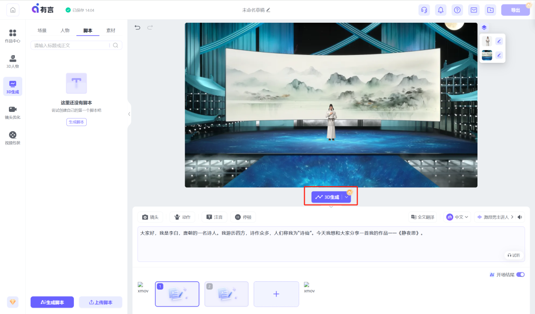 下面,跟锅头一起学习如何用有言快速创作一个3D数字人解说视频? ▌如何用有言快速创作一个3D数字人视频?打开电脑,在浏览器地址栏输入有言3D视频网址(www.youyan3d.com/?from=gzgtxai)进入主页,点击【免费注册体验】。 PS:建议用电脑打开使用哦 进入有言注册登录页面,点击登录界面的右上角【手机号/账号登录图标】。 进入手机号验证码注册登录界面,输入手机号+验证码,勾选阅读并同意用户协议,点击【登录/注册】。 注册登录成功,目前注册成功后平台赠送900言币,有效期为14天,需尽快完成试用体验哦。 锅头在这里直接点击【开始有言】。 进入有言3D数字人视频生成首页,点击右上角【新建作品】。 弹出新建作品窗口,点击【横屏】。 进入3D数字人视频创作界面,左侧编辑窗口默认显示【场景】-【场景库】界面,锅头在这里选择风格为“中国风”。 选择流光倩影国风舞台后,右边预览窗口可立即呈现效果。 场景选定后,接下来锅头点击【人物】进入人物库窗口界面,选择“诗仙李白”,看到场景舞台中的人物变成了诗仙李白。 人物选好后,咱们接下来点击【脚本】进入创建脚本窗口界面,目前支持自己上传脚本和AI生成脚本。 锅头在这里直接选择【Ai生成脚本】。 进入Ai生成脚本界面,输入AI脚本提示词,点击【发送图标】。 提示词:请以李白作为第一人称,生成一份李白自我解读《静夜思》古诗内容的解说稿,讲解之前先做自我介绍,60秒左右。 进入脚本创作页面,不到10秒钟脚本创作就完成了。若对脚本不满意可以选择提升表达、风格化改写、文案缩写和文案扩写,同时支持自定义描述优化脚本。锅头对AI本次创作的脚本比较满意,直接点击【应用脚本图标】。 应用脚本成功后,可以看到3D数字人视频编辑界面自动增加了视频片段和脚本内容。有言平台基于视频场景和时长,自动分成了2个视频片段和2段脚本。 视频片段和脚本创作好后,点击【3D生成】。 生成中。 生成完成,点击【播放图标】预览视频内容。 看完一遍后,锅头对本次3D生成的作品效果表示满意,点击右上角【导出】。 弹出导出窗口,输入视频名称,选择分辨率和视频格式后,点击【确认】。 点击【确认后】,跳转至个人空间的成片界面,看到视频正在合成中。 等待5分钟左右,咱们刚才创作的3D数字人视频合成成功,点击【下载视频图标】。 弹出视频播放界面,点击视频右下角【…】—【下载】,将视频保存至电脑本地文件夹。 到这里,咱们花了不到10分钟,就完成了一个形象生动的3D数字人讲解古诗的视频作品,你学会了吗? ▌学习总结