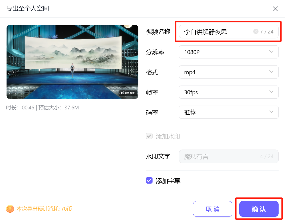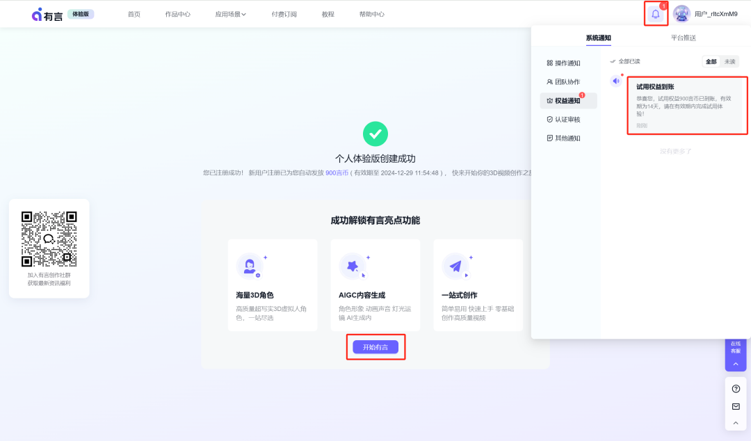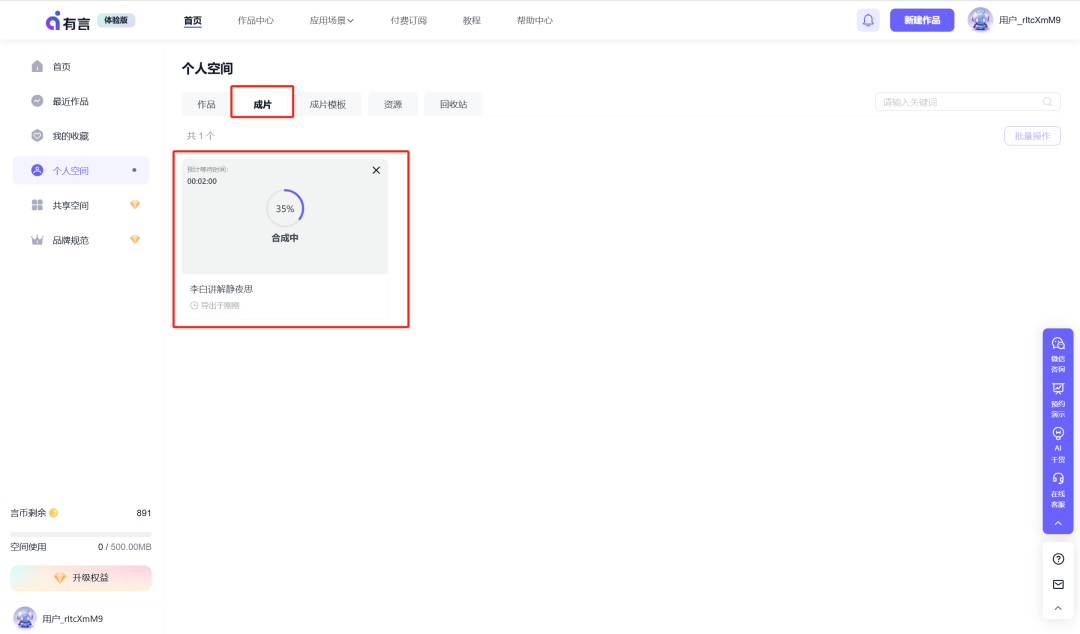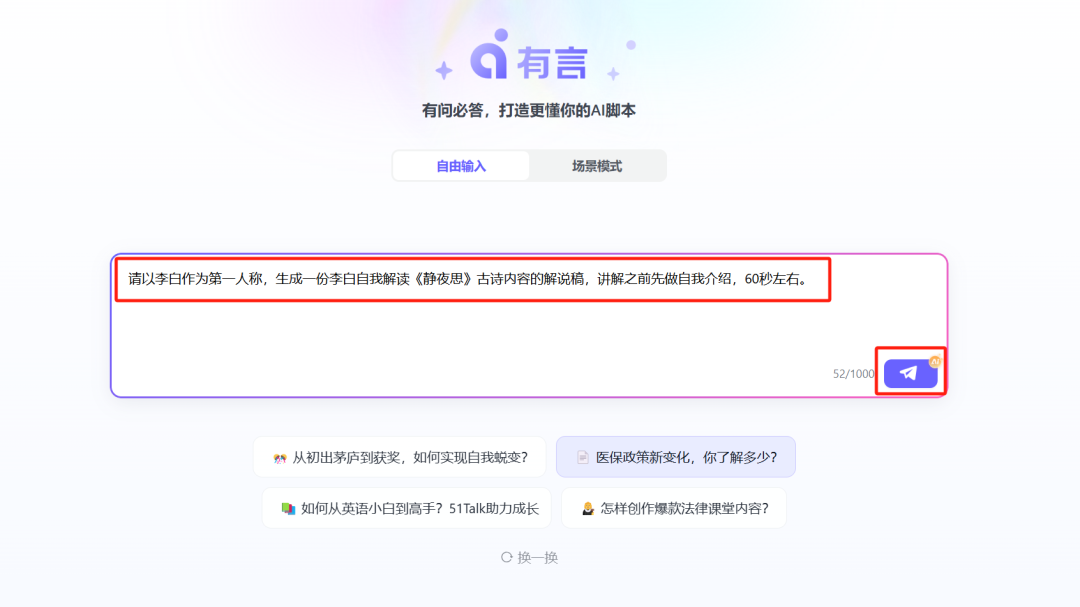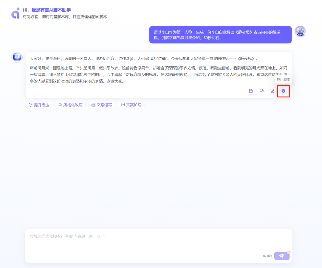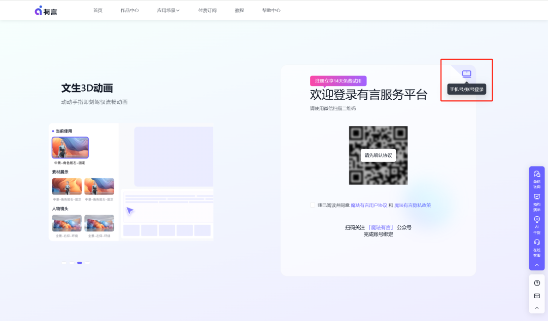 下面,跟锅头一起学习如何用有言快速创作一个3D数字人解说视频? ▌如何用有言快速创作一个3D数字人视频?打开电脑,在浏览器地址栏输入有言3D视频网址(www.youyan3d.com/?from=gzgtxai)进入主页,点击【免费注册体验】。 PS:建议用电脑打开使用哦 进入有言注册登录页面,点击登录界面的右上角【手机号/账号登录图标】。 进入手机号验证码注册登录界面,输入手机号+验证码,勾选阅读并同意用户协议,点击【登录/注册】。 注册登录成功,目前注册成功后平台赠送900言币,有效期为14天,需尽快完成试用体验哦。 锅头在这里直接点击【开始有言】。 进入有言3D数字人视频生成首页,点击右上角【新建作品】。 弹出新建作品窗口,点击【横屏】。 进入3D数字人视频创作界面,左侧编辑窗口默认显示【场景】-【场景库】界面,锅头在这里选择风格为“中国风”。 选择流光倩影国风舞台后,右边预览窗口可立即呈现效果。 场景选定后,接下来锅头点击【人物】进入人物库窗口界面,选择“诗仙李白”,看到场景舞台中的人物变成了诗仙李白。 人物选好后,咱们接下来点击【脚本】进入创建脚本窗口界面,目前支持自己上传脚本和AI生成脚本。 锅头在这里直接选择【Ai生成脚本】。 进入Ai生成脚本界面,输入AI脚本提示词,点击【发送图标】。 提示词:请以李白作为第一人称,生成一份李白自我解读《静夜思》古诗内容的解说稿,讲解之前先做自我介绍,60秒左右。 进入脚本创作页面,不到10秒钟脚本创作就完成了。若对脚本不满意可以选择提升表达、风格化改写、文案缩写和文案扩写,同时支持自定义描述优化脚本。锅头对AI本次创作的脚本比较满意,直接点击【应用脚本图标】。 应用脚本成功后,可以看到3D数字人视频编辑界面自动增加了视频片段和脚本内容。有言平台基于视频场景和时长,自动分成了2个视频片段和2段脚本。 视频片段和脚本创作好后,点击【3D生成】。 生成中。 生成完成,点击【播放图标】预览视频内容。 看完一遍后,锅头对本次3D生成的作品效果表示满意,点击右上角【导出】。 弹出导出窗口,输入视频名称,选择分辨率和视频格式后,点击【确认】。 点击【确认后】,跳转至个人空间的成片界面,看到视频正在合成中。 等待5分钟左右,咱们刚才创作的3D数字人视频合成成功,点击【下载视频图标】。 弹出视频播放界面,点击视频右下角【…】—【下载】,将视频保存至电脑本地文件夹。 到这里,咱们花了不到10分钟,就完成了一个形象生动的3D数字人讲解古诗的视频作品,你学会了吗? ▌学习总结