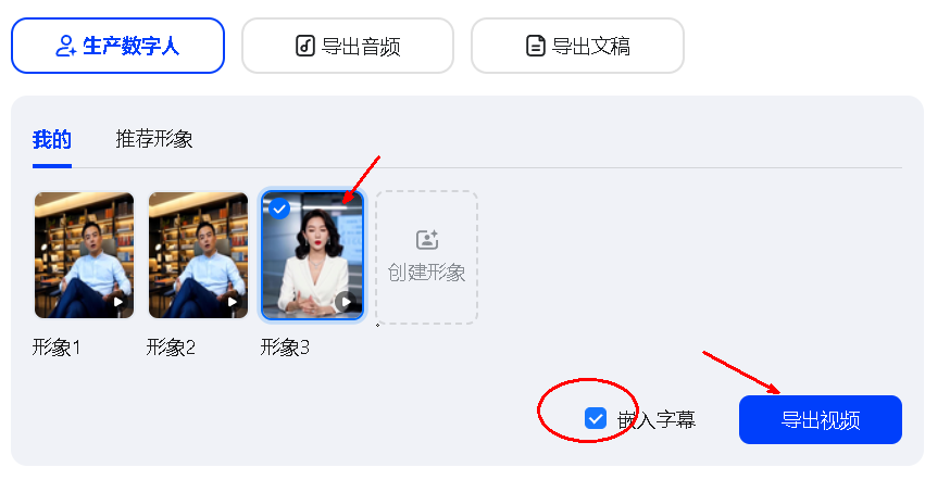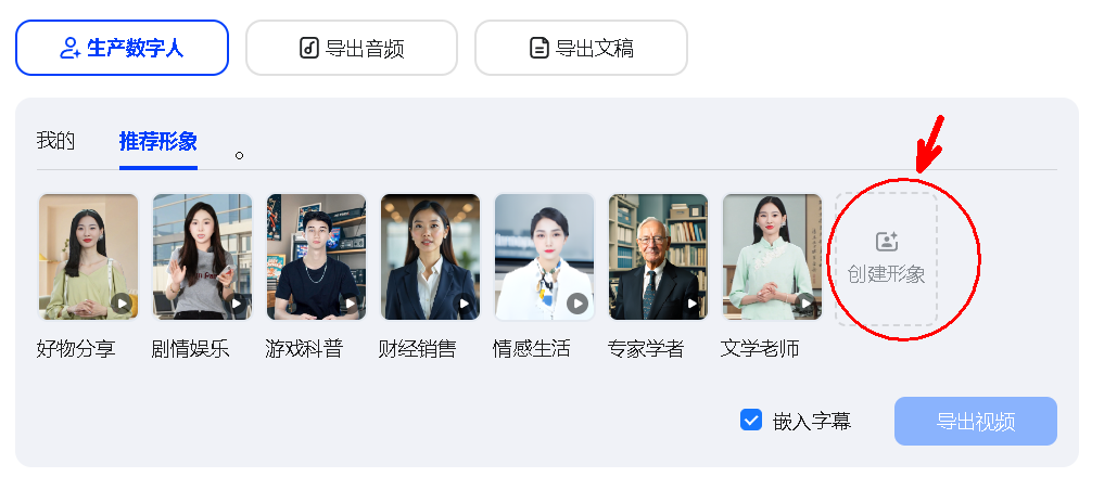 从生成口播稿、爆款标题一路点击下去,到“多格式导入” 如果还没有数字人,点击“创建形象”