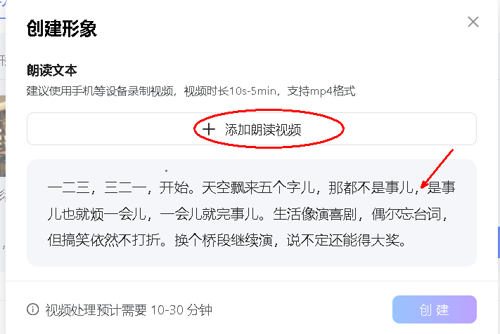 这个就是我刚刚生成的,下面就教大家怎么做 平台会让你上传一段视频,语音需要使用下图中的文字,读完大概 30 秒首先在纳米搜索中点击"创建形象":