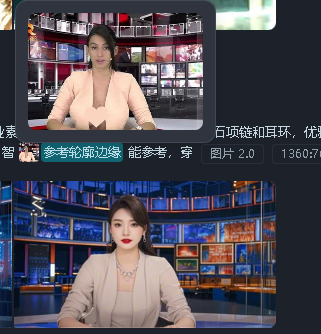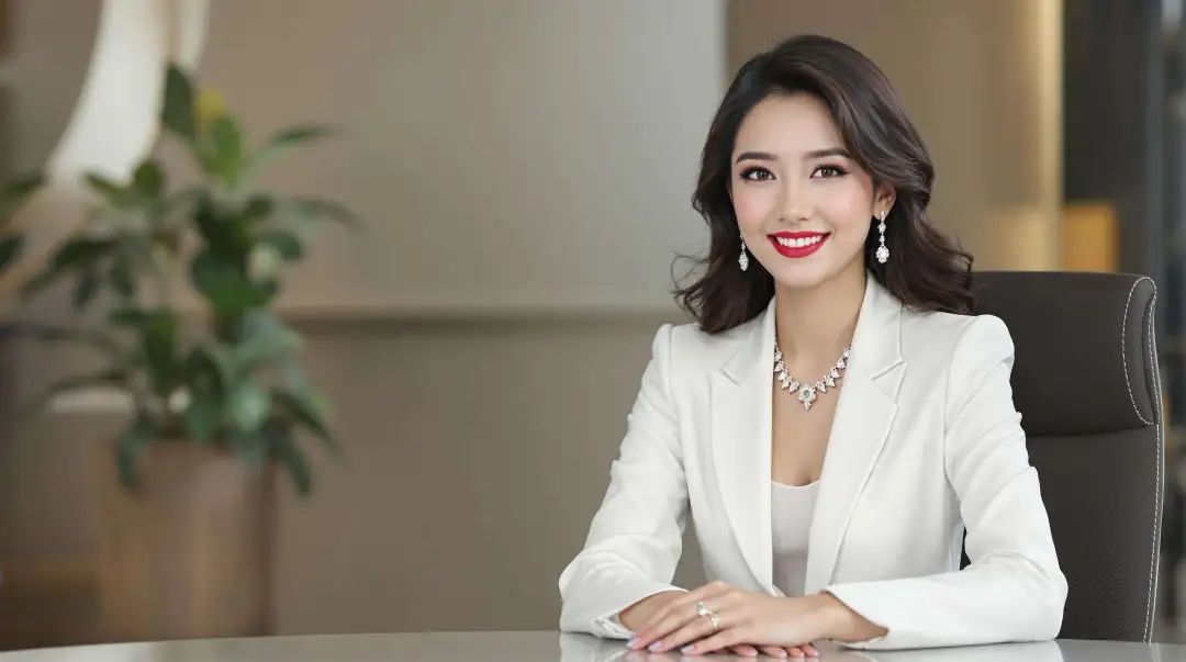 我让 kimi 写了段绘图提示词:“半身照,在一个现代化的演播室内,坐着一位端庄的亚洲 25 岁女性,她身着有设计感的纯色高端职业装,简洁利落的设计彰显着她的职业素养与领导气质。她佩戴着精致的钻石项链和耳环,优雅而不张扬。她的头发梳理成干练的复古波浪发型,妆容精致,特别是鲜红色的唇妆突显她的自信与成熟魅力。她的目光坚定而温和,微笑中透着沉稳与睿智。她的双手自然的放在演播台上” 然后输入即梦,抽卡几次,