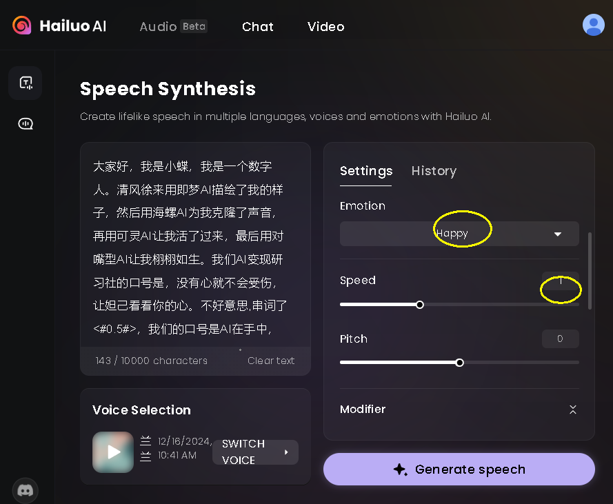 下面,我们克隆声音,把刚才纳米要求的“一二三四五”的那段话克隆下来 来到海螺海外版,选择之前克隆的一个音色,录入台词,得到配音