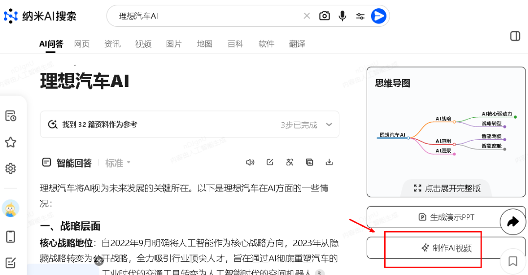 如果无法使用 dreamface 的可以使用即梦(比可灵效果好) 二、训练数字人有了训练素材后,就可以开始训练数字人了 经过实测,纳米搜索、飞影、硅基都可以使用上一步的视频素材 我们以纳米为例,有两个地方可以进入视频制作 在 n.cn 或 bao.360.com 搜索完信息后,右边有一个“制作 AI 视频”