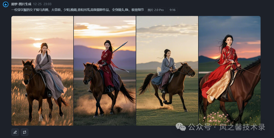 实战步骤 1.打开即梦平台 网址: https://jimeng.jianying.com/ 提示词: 一位穿汉服的女子骑马奔腾,大草原,夕阳,晚霞,柔和光线,高级摄影作品,全身镜头,8k,极致细节