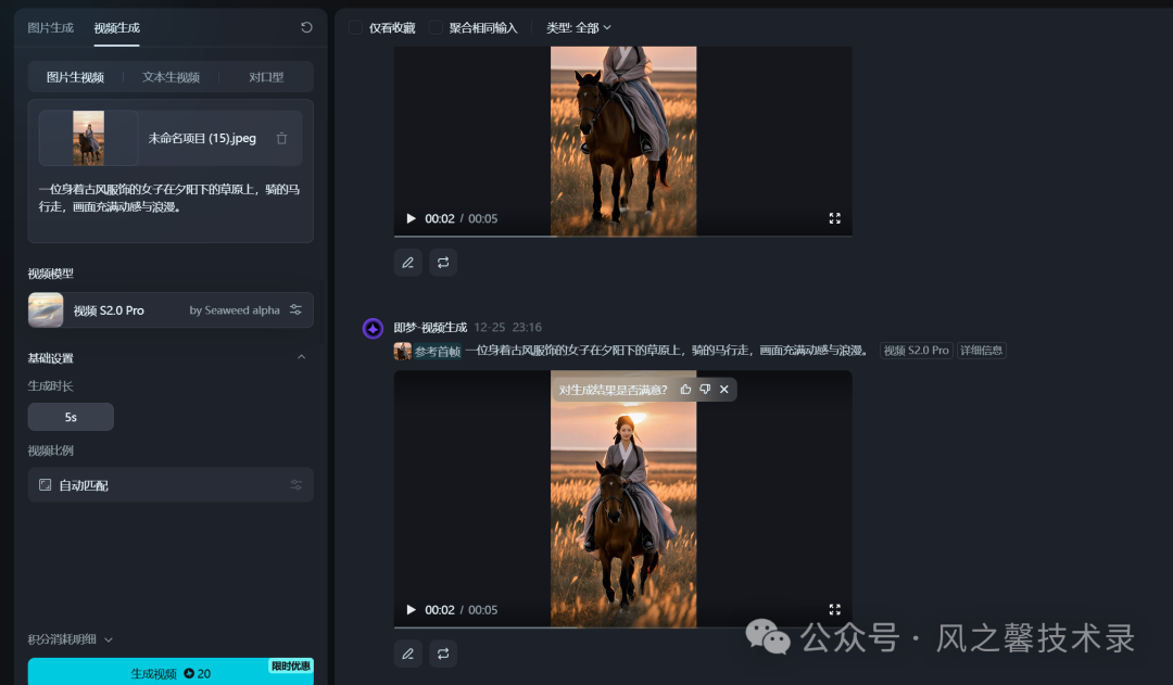 上面的提示词只要替换红色字体即可,看你想要什么样的场景描述好进行生图,生图不好就多抽卡几次就可以。 点击图生视频,视频生成模型选择s2.0pro 画面描述: 一位身着古风服饰的女子在夕阳下的草原上,骑的马行走,画面充满动感与浪漫。