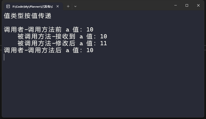 传递值类型变量对应的栈空间地址就意味着形参与实参共同指向相同的内存地址,所以才导致对形参修改时,实参也会同步发生变化。 我们用一个小例子演示一下: 执行结果如下: