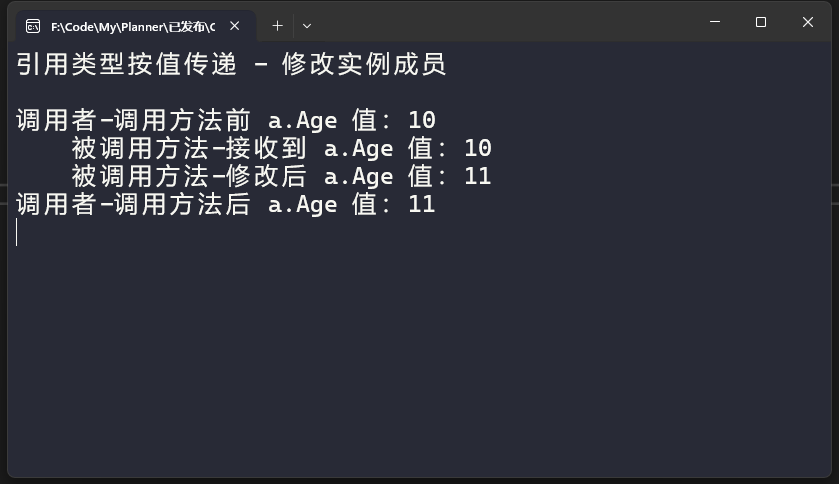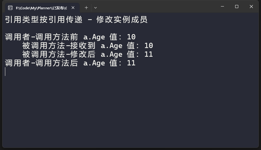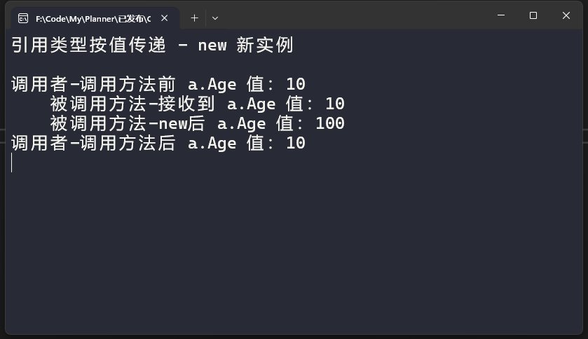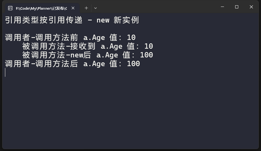 可以看到被调用方法中a实例对象的Age属性发生变化后,调用者中变量也同步发生了变化。 对于第二个结论我们这样论证,在方法中直接对参数new一个新对象,看看原变量是否发生变化,代码如下: 执行结果如下: