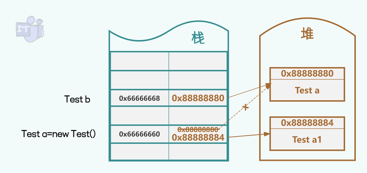 可以发现当在方法中对变量执行new操作后,调用者处的变量并没有发生变化。 为什么会这样呢?因为对于引用类型来说,形参和实参是对引用类型的实例对象引用的两个副本,而这两个副本存储在栈上又分别在不同的内存地址空间上,而new主要就是重新分配内存,这就导致形参变量a=new后,栈上形参变量a指向了Test新的实例对象的引用,而实参变量a还是保持原有实例对象引用不变。 如下图所示。