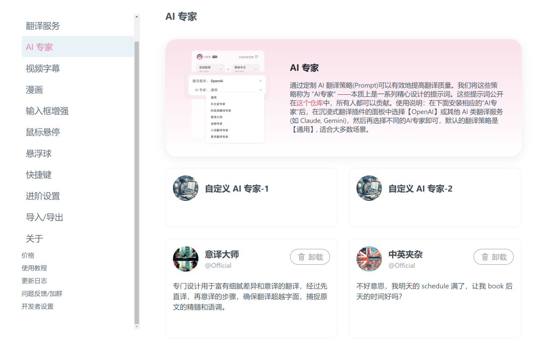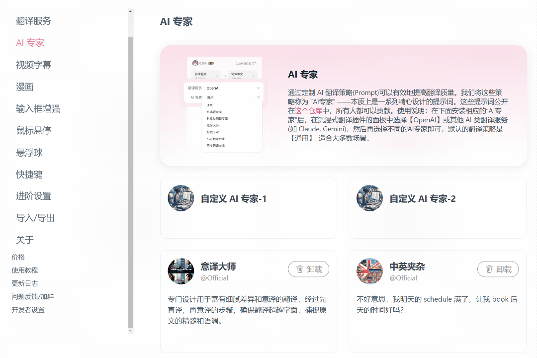 Prompt沉浸式翻译还有很多Prompt(提示词),让不同网站翻译更加智能准确。 它自带很多Prompt,比如像新闻媒体,论文,法律行业,设计师等等各行各业。