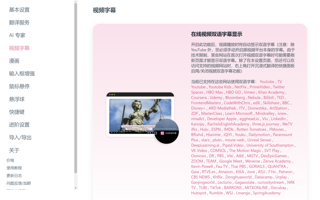 看剧自动翻译沉浸式翻译竟然还支持视频双语字幕显示。
