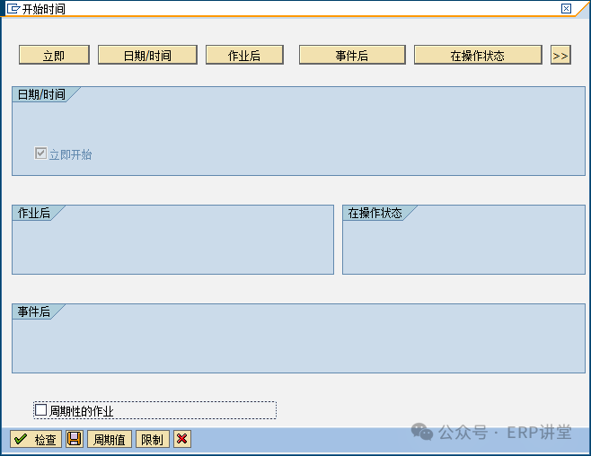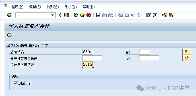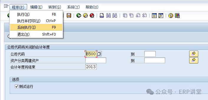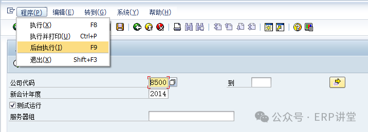 1.1.2.3操作步骤(1)在事物代码输入框中填写AJRW,回车: (2)输入公司代码和会计年度,测试运行。 (3)无误后,去掉测试运行,点击“程序”—“后台执行”: