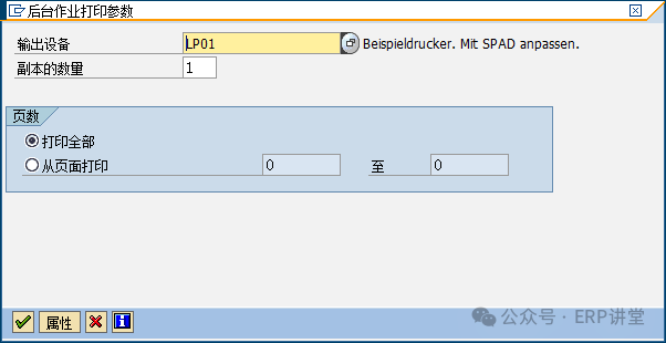 1.1.3.3操作步骤(1)在事物代码输入框中填写AJAB,回车: (2)选择公司代码、结束的会计年度后,点击测试运行: (3)点击“是”,进入下列界面: (4)系统提示无误后,去掉测试运行,点击“程序”—“后台执行”: (5)点击“程序”—“后台执行”,进入下列界面: (6)选择输出设备,点击或回车: (7)点击后,再点击保存,系统提示信息“已安排后台作业”,系统会在后台执行资产余额结转,如图所示: