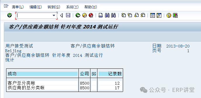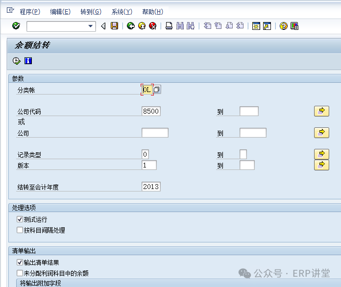 1.1.3.4结论资产余额结转至下一会计年度。 1.1.3.5备注 1.1.4系统操作—总账余额结转1.1.4.1操作范例将总账余额结转至下一会计年度。 总账科目结转,将总账科目余额结转到新的会计年度。结转后,下一年的报表中会有期初余额。 1.1.4.2系统菜单及事务代码