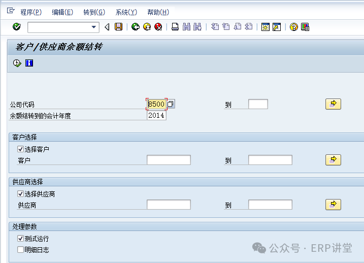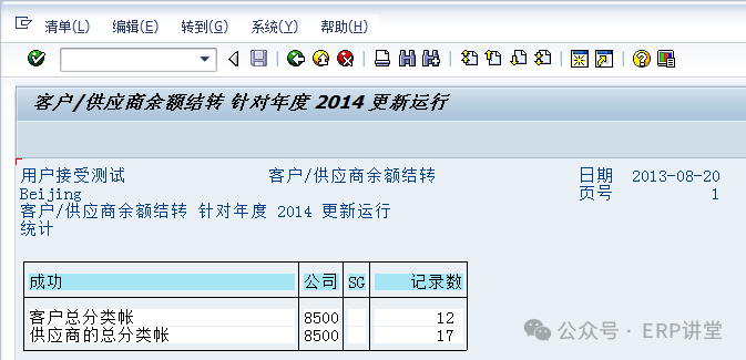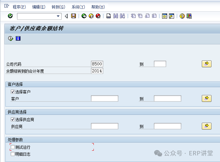 (2)输入公司代码,结转的会计年度等信息后,选中测试运行,点击,系统提示下列标记信息: 点击按钮,退回到初始界面,取消选择“测试运行”后正式运行即可。 1.1.4.4结论总账余额结转至下一会计年度。 1.1.4.5备注1.1.5系统操作—应收应付往来余额结转1.1.5.1操作范例应收应付科目余额结转至下一会计年度。 在年结时,需要对应收应付的余额进行结转到下一年度,通过结转,在下一年的相应报表中有相应的期初余额。 1.1.5.2系统菜单及事务代码