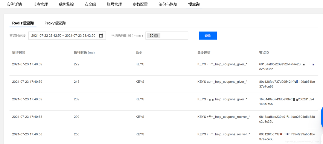 这是腾讯云上Redis集群服务中,慢查询的日志。我们看到,Keys命令大概执行了250ms ~ 300ms。