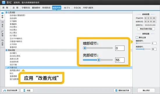 将背光视频导入影忆后,我们同样在“画面风格”面板中找到“改善光线”功能。通过调整“暗部细节”和“亮部细节”的参数,我们可以显著改善背光问题。一般来说,将“暗部细节”拉到最左边,可以减少暗部的细节;而“亮部细节”设置为55左右,可以平衡画面的亮度。