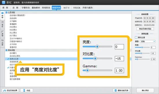 使用影忆调节光线不足的视频非常简单。首先,打开影忆,将需要调节亮度的视频拖曳到软件中。然后,在“画面风格”面板中找到“亮度对比度”功能,通过向右边调整“亮度”滑块,我们可以轻松调亮视频。