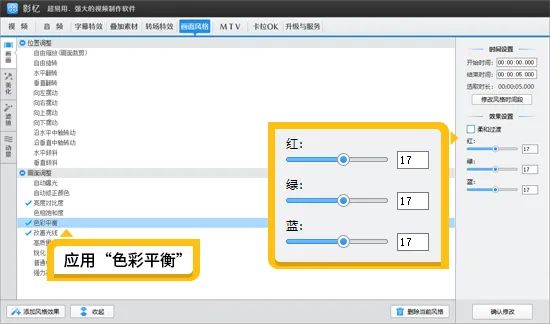 改善光线后,可能还需要进一步调整画面的明暗对比。这时,我们可以使用“亮度对比度”功能,将亮度设置为0,对比度调成-15。降低对比度可以让画面的明暗对比更加和谐,减少过曝和过暗的情况。接下来,为了增加一些白光,我们应用“色彩平衡”功能,将红、绿、蓝三个通道的数值都调成17左右,这样可以让画面看起来更加明亮和通透。