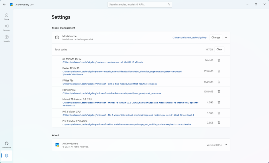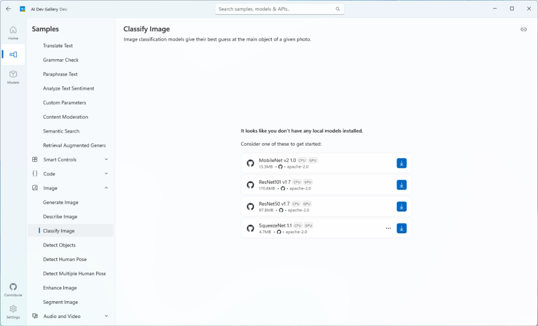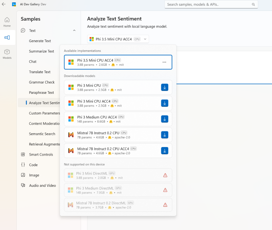 AI Dev Gallery集成了来自微软自家和第三方平台(如Hugging Face、GitHub)的预训练AI模型。