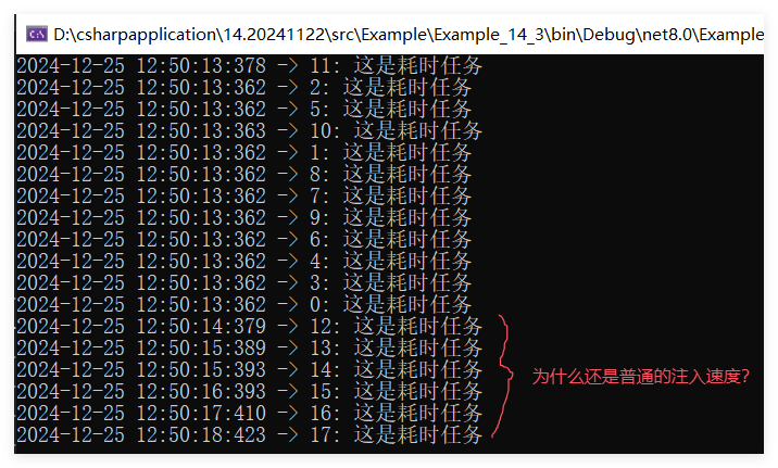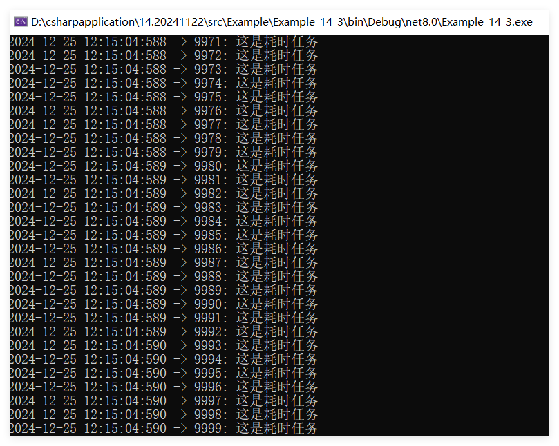 Console.WriteLine($"{DateTime.Now.ToString("yyyy-MM-dd HH:mm:ss:fff")} -> {idx}: 这是耗时任务");