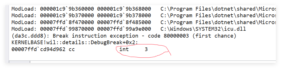 这个 Debugger.Break(); 发出的 int 3 信号,我们可以用 VS,DnSpy,WinDbg 这样的调试器去捕获,参考代码如下: