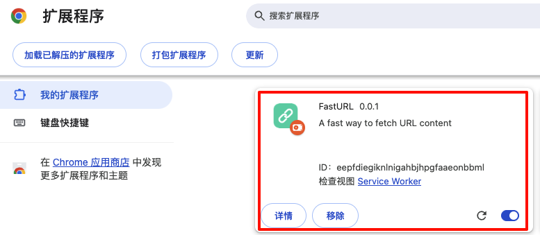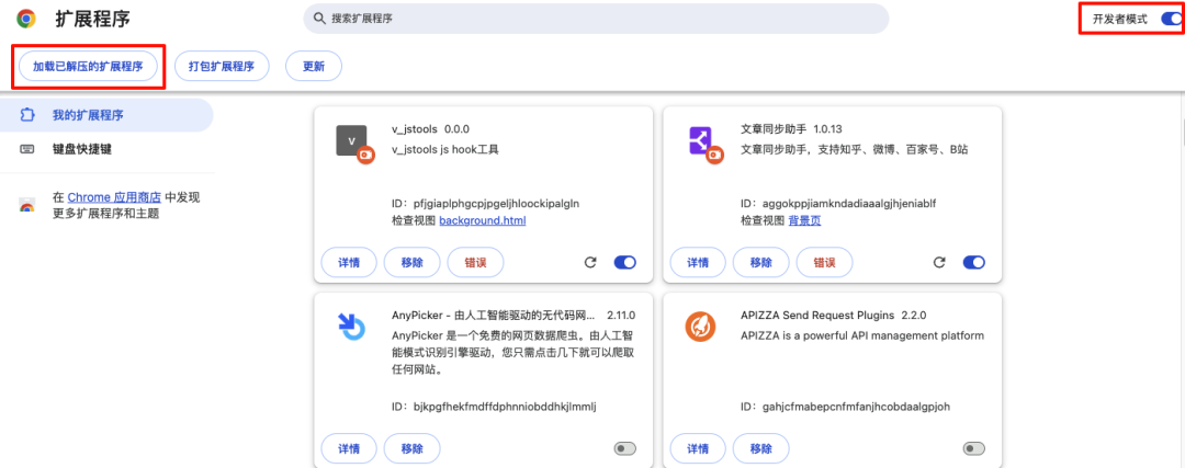 打开 Chrome 浏览器,访问 chrome://extensions/,并启用右上角"开发者模式",最后点击"加载已解压的扩展程序",选择解压后的文件夹