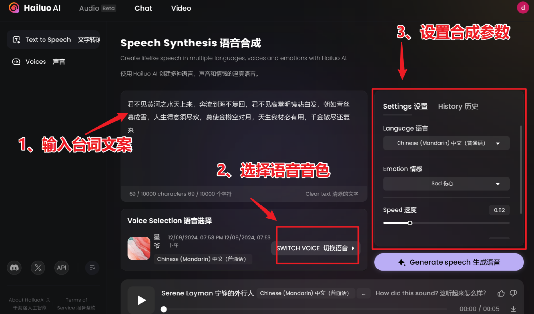 免费,使用简单,效果又好的AI配音神器来了 海螺AI海外版,上线了video,一个在线TTS类AI应用 1、在线克隆音色 仅需10秒音频样本,就能克隆任何人原声,不仅能高度复刻原声音音色,还能自由切换快乐、伤心、生气等7种表达情绪,控制速度。 这是大话西游星爷经典片段 视频加载失败,请刷新页面再试 相似度很高了,语气氛围很丰富。 再换个快乐情绪 悲中带一点喜,情绪拉满,完全听不出是AI。 这几个效果,我感觉是很棒了。 2、内置全球10国配音员 内置中英法意俄等10国配音员,提供口音、性别、年龄段等选项,声音质量高,情绪丰富,输入文本即可直接合成语音,拟真度高。 使用教程 1、克隆音色 打开左侧voices栏,选择创建音色,然后,简单三步即可完成克隆。 音频样本10秒以上,30秒左右会更好。