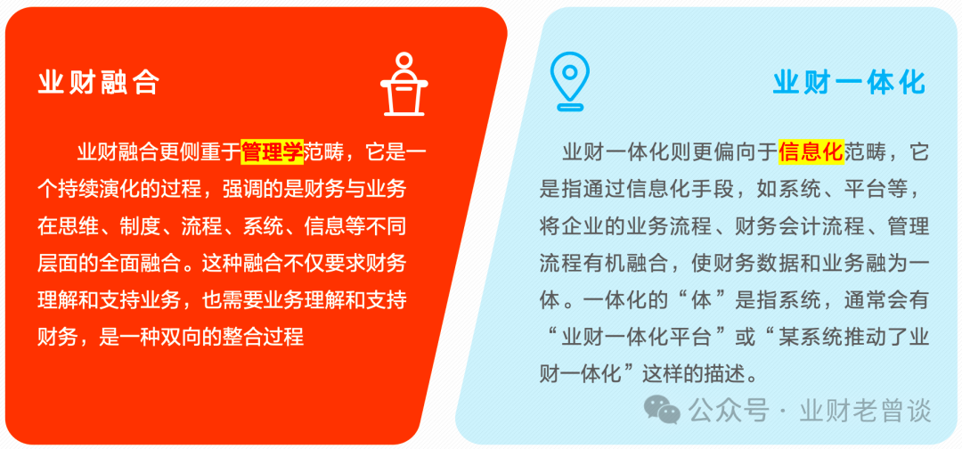 业财一体化与业财融合比较相似,许多人把二者混为一谈,甚至概念搞反了,他俩有何异同呢? 从定义来看,业财一体化(Integrated Business and Finance)是指将企业的业务活动与财务活动进行信息化、系统化的统一管理,通过先进技术手段,将业务流程、财务流程、管理流程有机整合,建立基于业务事件驱动的财务一体化信息处理流程,使财务数据和业务数据融为一体,打通信息孤岛、流程断链现象。