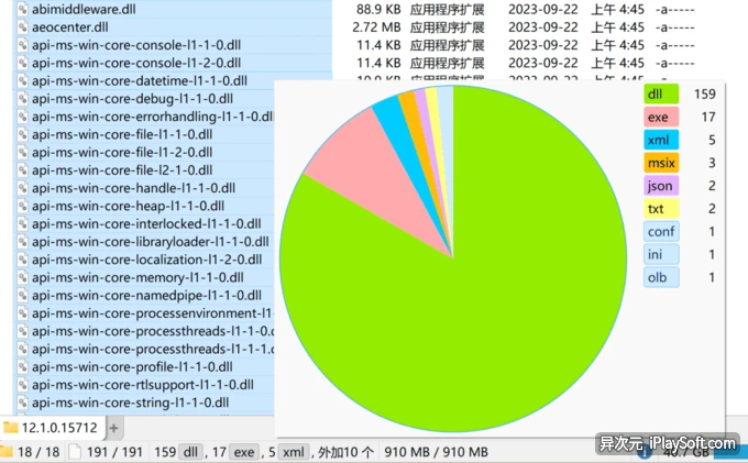 文件类型统计在底部的状态栏中,可以显示文件类型统计,饼状图查看各个类型占比,了解文件夹下各文件大小。