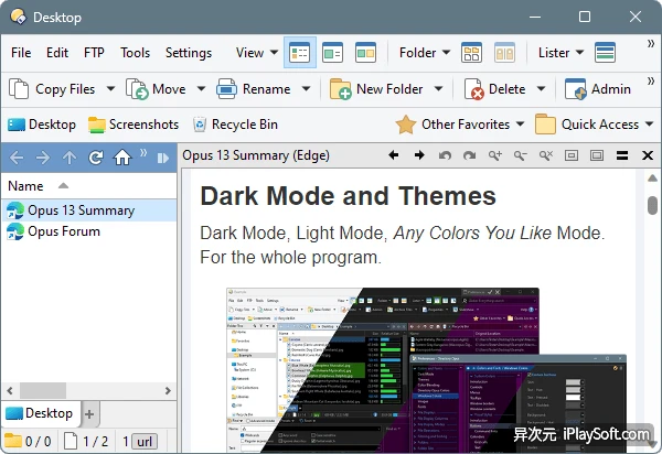 Directory Opus 13 有哪些新功能特性?Directory Opus 已经是一款相当老牌的经典级软件了,原本无论在稳定性和功能性上都已经做到比较出色了。而最近 Directory Opus 13 依然为用户带来更多现代化的新特性,拥有更好的表现。 深色主题样式:比如最直观的外观上,新版本的 Directory Opus 终于支持了很多人喜欢的深色主题样式,深浅样式可以选择也可以自动适配,夜晚工作的朋友也不再需要承受刺眼的白色了。
