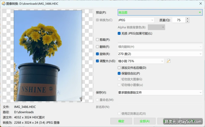 导出图片转换参数配置图片转换参数可以保存为预设了,方便后续直接套用原来的参数设置。
