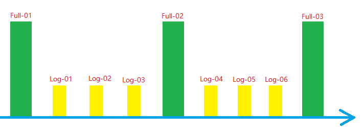 我们知道SQL Server三种常用的备份类型:完整备份、差异备份、日志备份 如下,当我们对数据库进行以下备份计划(数据库必须进行首次非COPY_ONLY的完整备份,才能进行差异或日志备份)