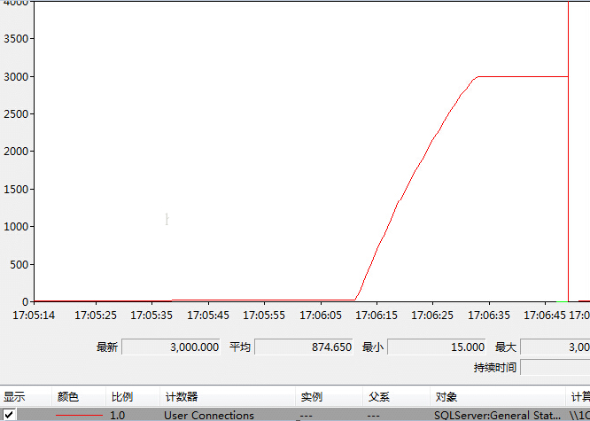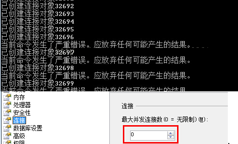 测试三: 设置max poolsize=40000,即连接池40000,MSSQL 连接限制3000 MSSQL 中执行以下代码,然后重启数据库服务: