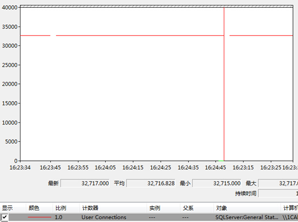 以上监控可以看到,MSSL 连接峰值为32717,加上数据库系统自己默认占有的50个连接,总数为32767,即为数据库的最大连接数。在连接过程中,CPU和内存开销很大! 在出错的情况下还继续创建对象,但是数据库连接数是没有增加的,连接对象都保存到连接池中,还在等待连接数据库。 当连接池连接数达到最大值时,如下图到达 39999 时,程序将自动关闭并退出!本人电脑几乎卡死!数据库连接数回到正常,数据库内存仍然很大,还是很卡!最后重启数据库服务释放内存!