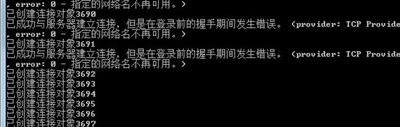 当通过连接池连接数据达到2982时,发生了错误。加上数据库系统中的18个session,连接总数为3000. 这个错误网上很常见,连接池虽然可以继续创建新的连接,但是无法与数据库端连接。出现此错误可以判断是数据库端没法连接到。如果不是最大连接数出错,可能是tcp/ip协议未开启、端口未打开或被隔离等。 成功与服务器建立连接,但是在登录前的握手期间发生错误。(provider:tcp provider error:0 –指定的网络名不可再用。) 接下来在数据库中,删除1000个sleeping的session: