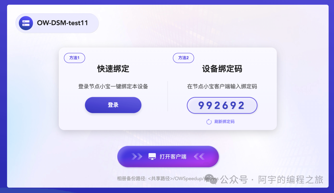 登录NAS,在套件中心/应用中心打开节点小宝,在打开的新网页中可看到绑定码;