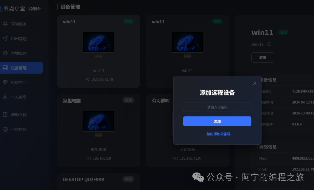 打开PC客户端-控制台-设备管理-添加远程设备-输入即完成绑定